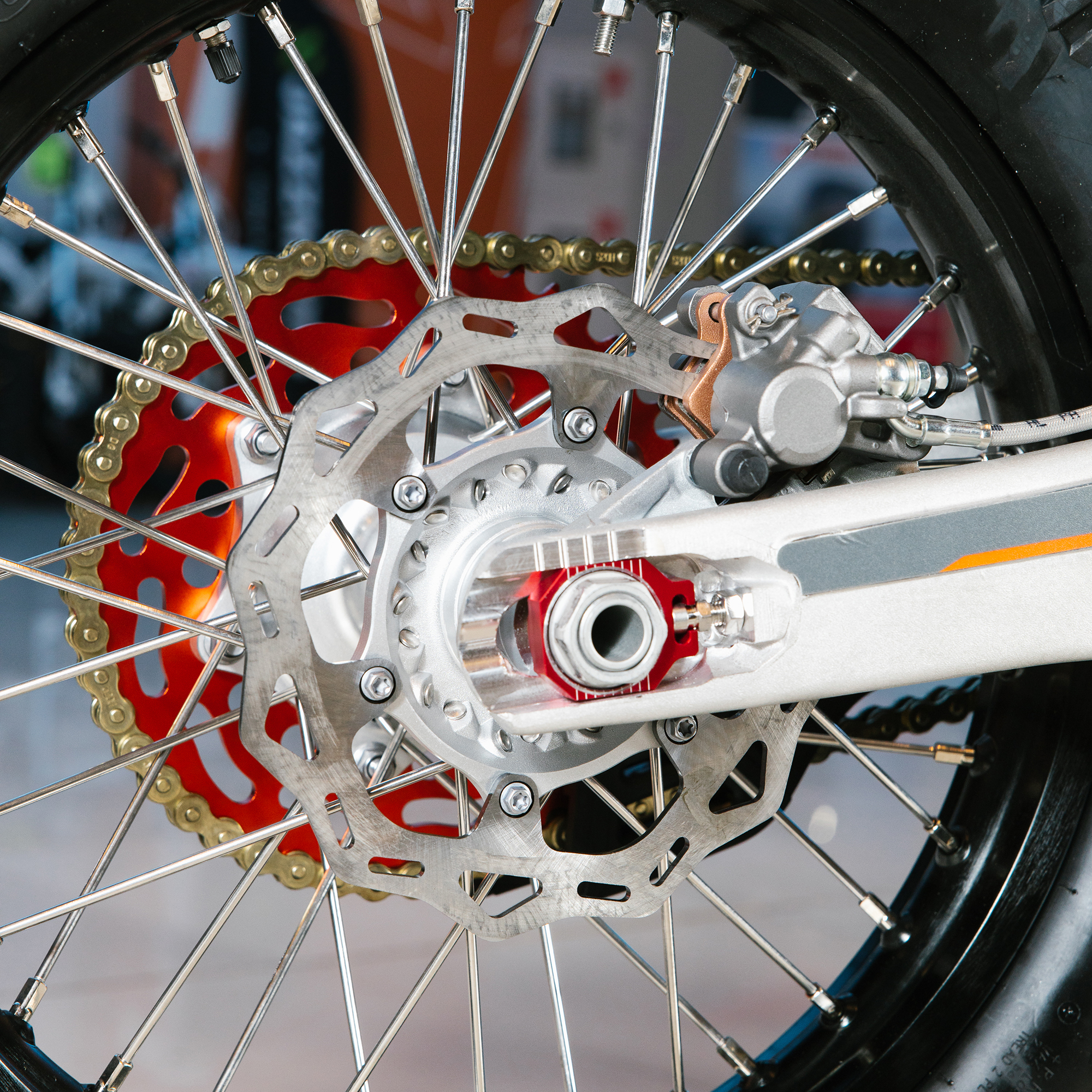 Спереди и сзади установлены антибуксаторы бренда "AJ1", которые притягивают покрышку к ободу, позволяя ездить по бездорожью при низком давлении в камерах, не давая покрышке проворачиваться во время езды. Размер передней покрышки: 80/100 R21. Размер задней покрышки: 120/90-R18. Модель комплектуется "жирной" резиной "KENDA". Все эти характеристики позволяют мотоциклу отлично себя чувствовать в песке и грязи.